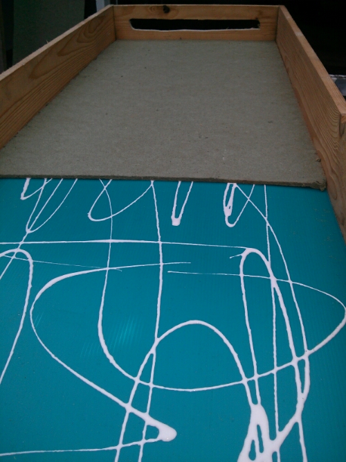 Her ses hvordan resterne af støjdæmpe måtter fra gulvbelægning, bruges til at isolere bagsiden, sammen med affald fra emballagen fra et drivhus fra jemogfix.