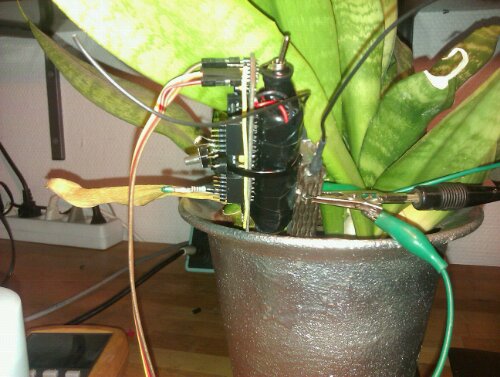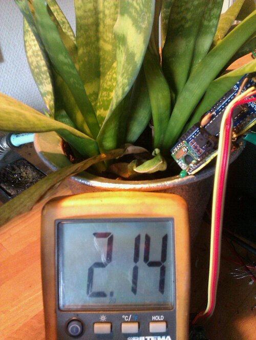 I den potteplante der blev brugt til at måle på, var spændingen ud lidt under 1,2 volt når jord var ny vandet og 3,3 er når sensor et trukket op. så alt mellem 1,2 og 3,3 volt betyder den bliver mere og mere tør. Inden den konkrete potteplante blev vandet måltes der 2,5 volt, den var ikke helt tør lagt.