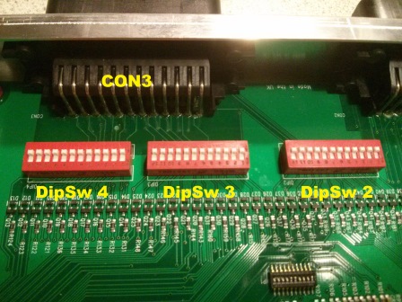 Her ses et nærbillede af dip switche og CON3: