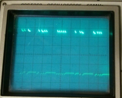Herover ses et oscilloskop billede af pulserne på txd på curtis som sendes til displayet og laver en stribe stjerne i bdi 840 display.