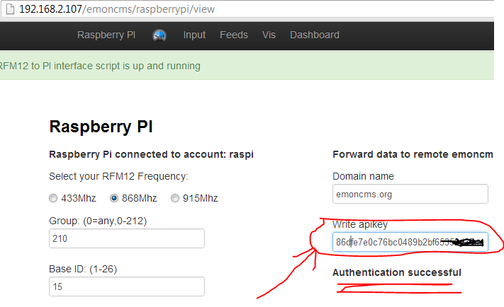 emonBase indsæt api key og check authentication med emoncms.org er ok