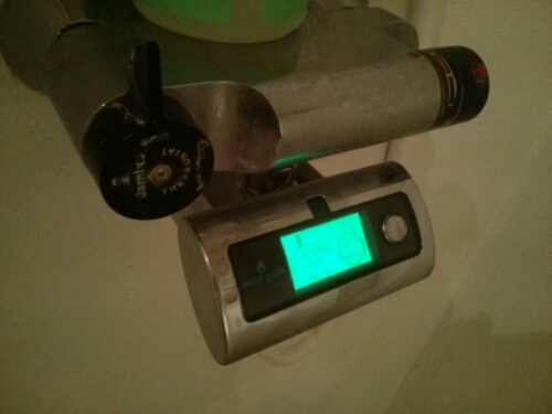 En Waterguide kaldes det lille sjove realtids vandur, med visning af forbrug i liter her og nu, tid brugt under bruseren, vandets temperatur, samt total vand forbrug ved endt brusebad.
