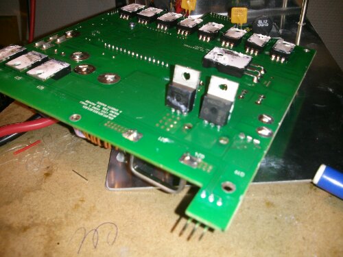 Skilte den ad og målte på MOSFETs i udgang , der sidder tre parralelt og alle tre var døde. Havde ikke den rigtige type liggende, så fandt nogle der ligner. Det er logik MOSFETs irf640. Den har 80% større Ron modstand end den der skal bruges: 4n06l05