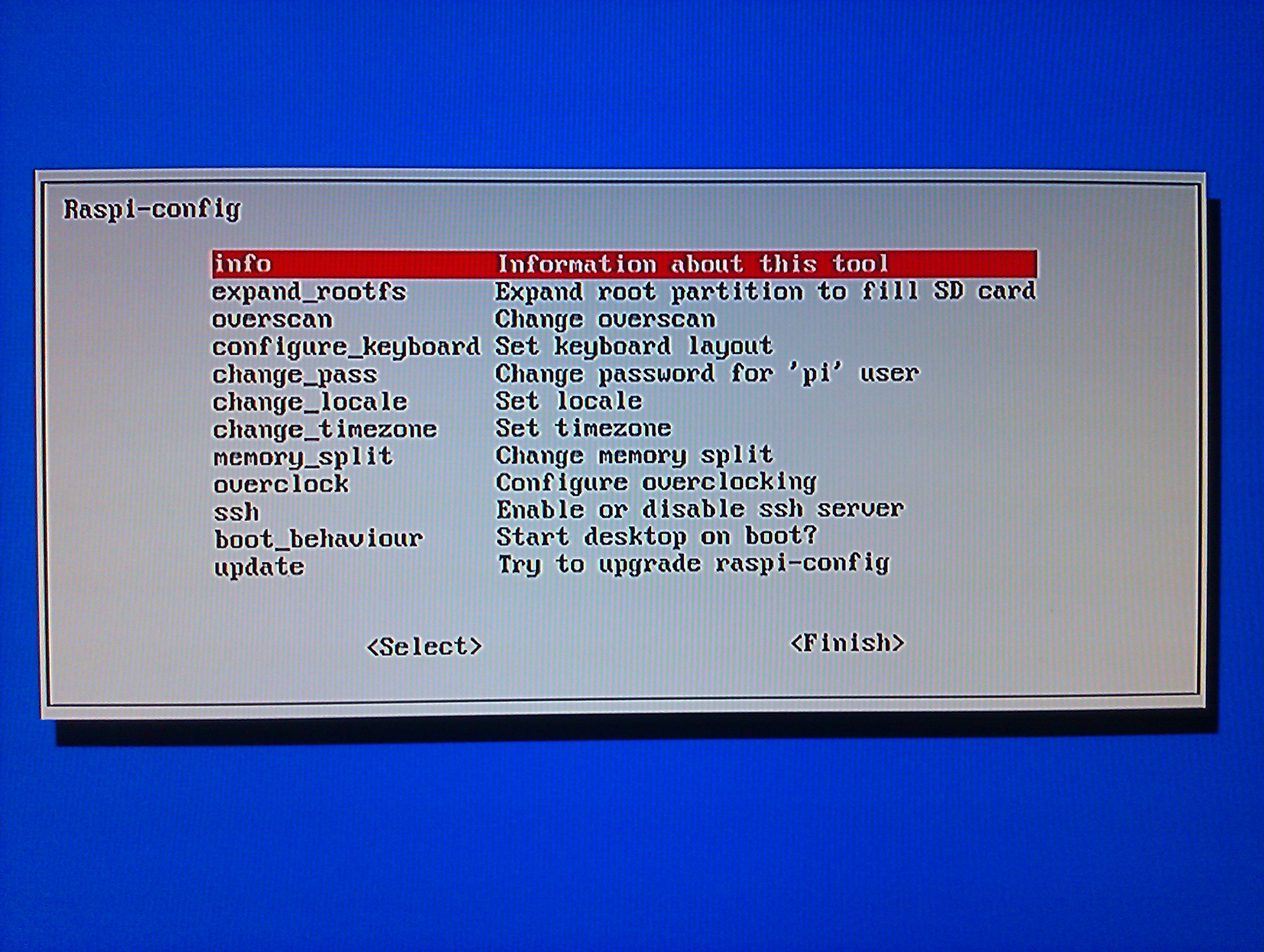 Rasppery pi er bootet første gang med ‘Raspian image’ og der er nu en menu ‘Raspi-config’
