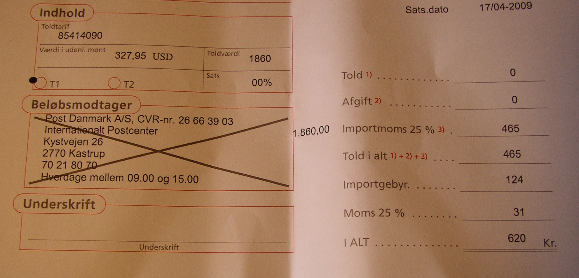 Post danmark opkræver import momsen og gebyret.