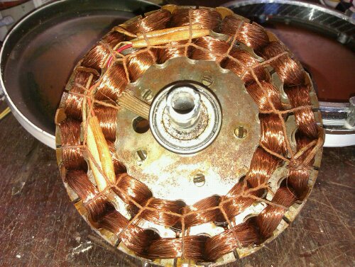 En skrottet loftventilator indeholder lejer, aksel og svøb til en generator. Regner med det kan laves af nogle neodym magneter og nogle selvviklede spoler.